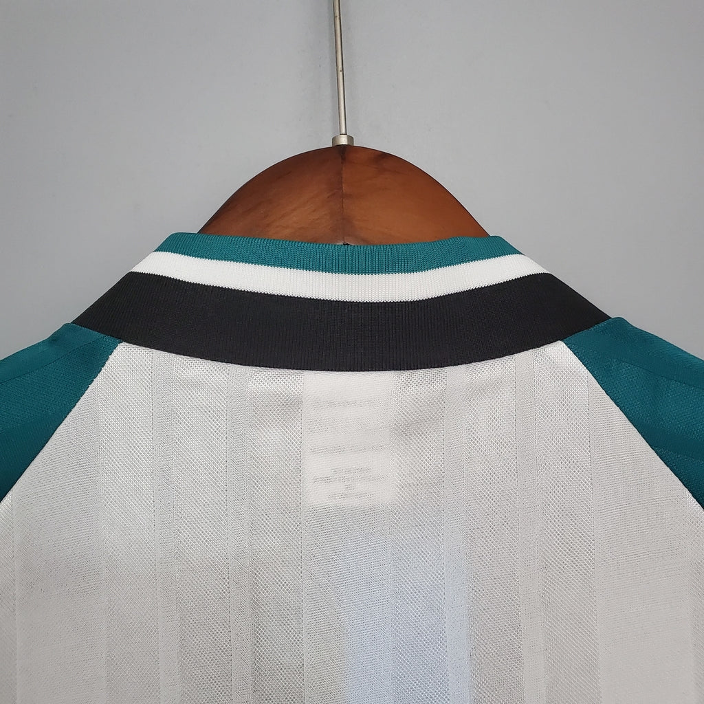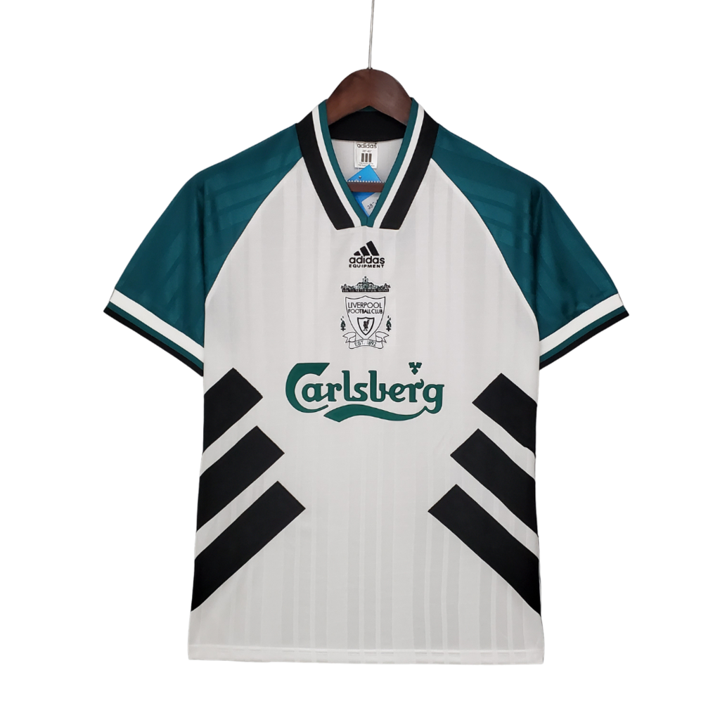 Camiseta retro de visitante del Liverpool 93/95 de Adidas para hombre (blanco, verde y negro)